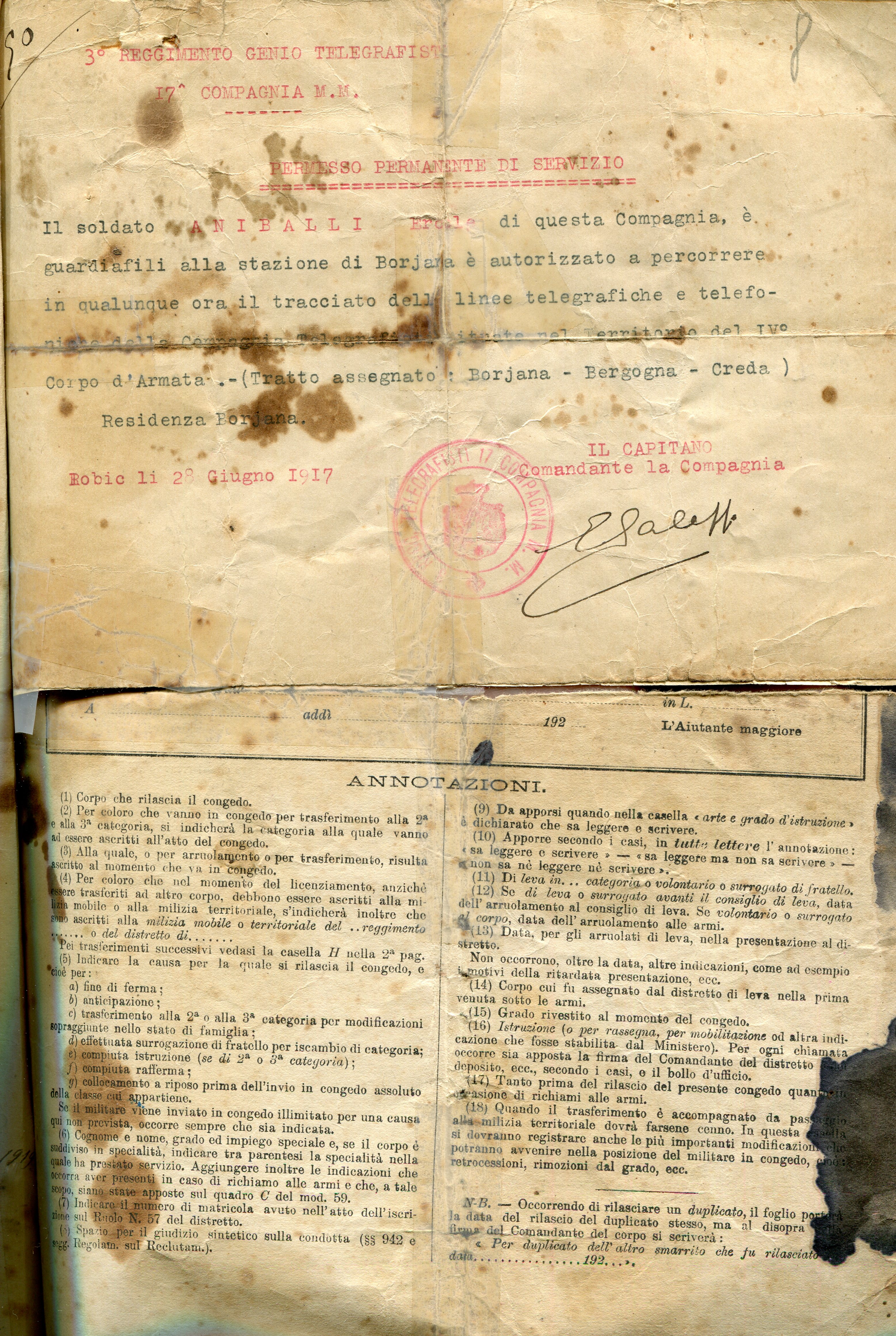 Lo stesso Ercole, nominato guardiafili, fu autorizzato a percorrere il tracciato delle linee teleferiche durante il giorno e la notte. Il tratto a lui assegnato fu: Borjana – Bergogna – Creda, come si può vedere dal permesso da guardiafili di seguito. La particolarità del permesso è la scrittura a macchina. Infatti nei primi anni del ‘900 si cominciavano ad utilizzare le macchine da scrivere.