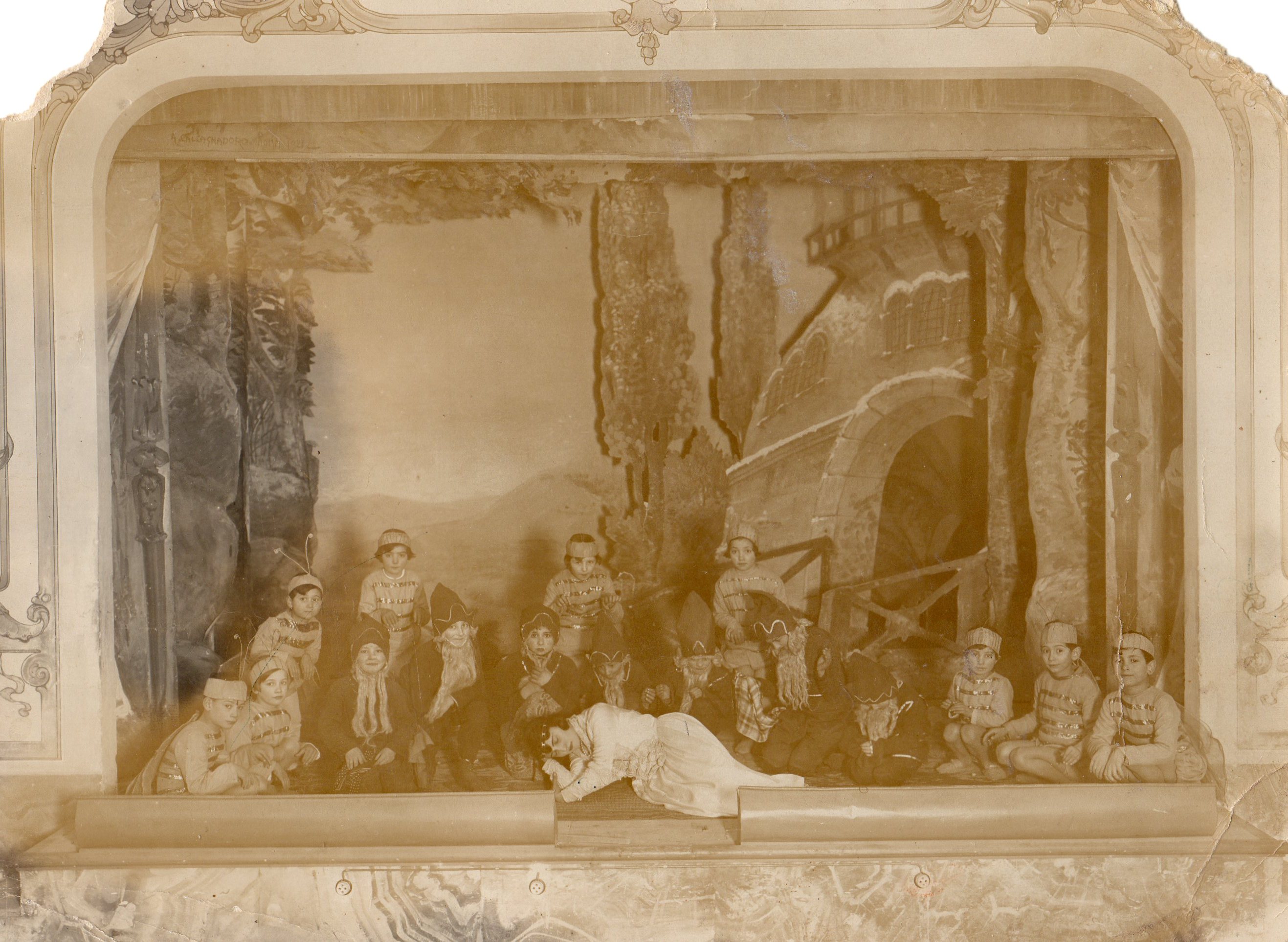 Grazie ai riferimenti nel retro della stampa, sappiamo che Weiss frequentava allora, la seconda classe. Ci sembra di poterla riconoscere nel terzo “nano” di sinistra. Con le manine si stringe la lunga barba finta e il suo viso, pieno di stupore infantile, contribuisce a rendere la scena ancor più fiabesca, inserita in un tempo quasi indefinito. Bellissimo appare il volto di Biancaneve o forse, di una Bella addormentata che avvolta nel suo candore, sembra riproporre i canoni estetici dell’epoca che si andavano imponendo grazie anche alla diffusione del cinematografo. Il palco è inquadrato integralmente e non è da escludere che la scena sia stata preparata durante un momento di prove dello spettacolo. Il pubblico comunque, non compare.