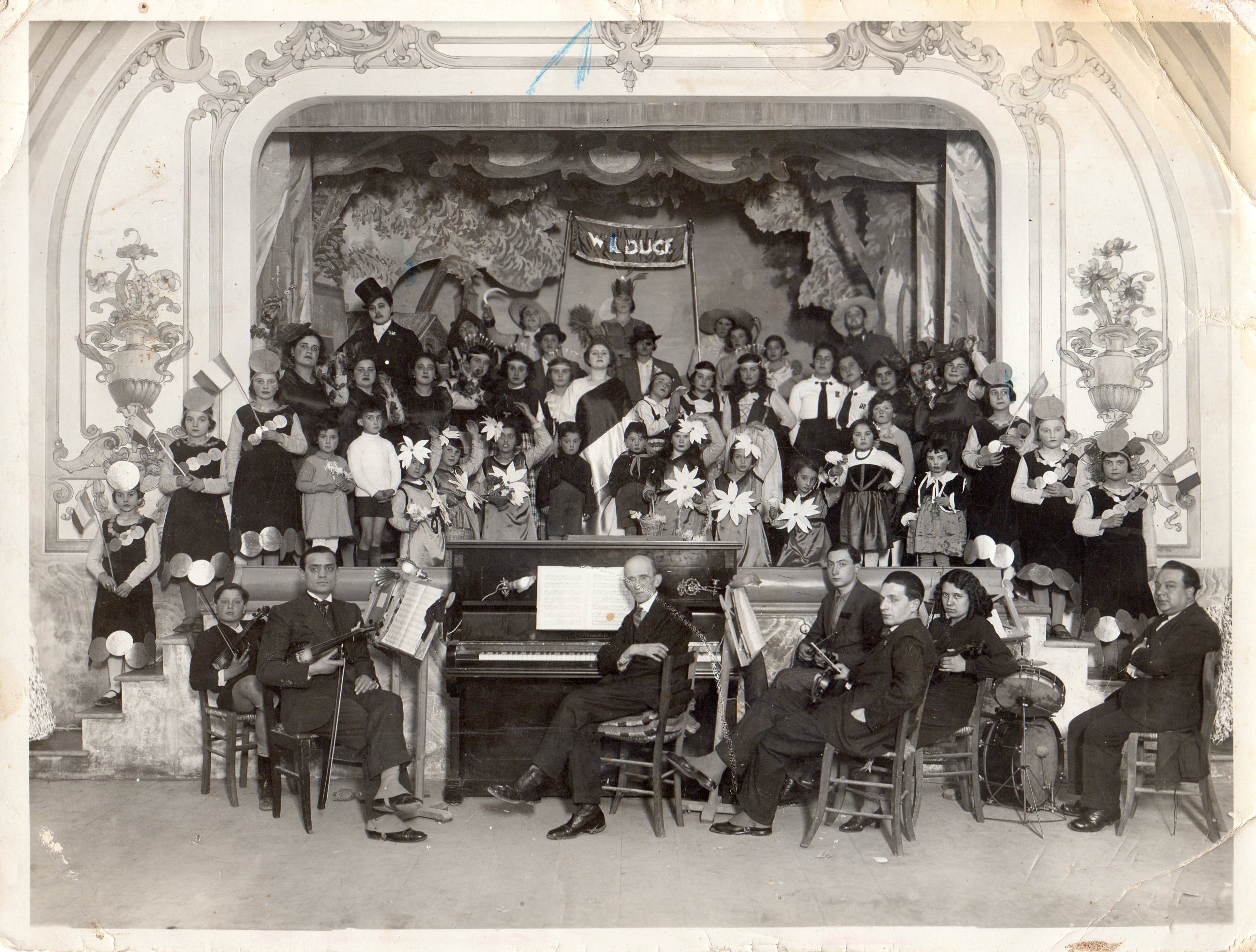 Entrambe le fotografie sono state scattate nel mese di febbraio. Questo induce a pensare che le due recite, siano state organizzate durante la ricorrenza del Carnevale, tradizione che a Rieti, una volta, era molto sentita. I volti dei protagonisti non sembrano però trasmettere la serenità e la spensieratezza di una recita carnascialesca. Sembrano piuttosto tesi e preoccupati. Forse allo spettacolo era stata invitata qualche autorità legata al PNF. Non sappiamo se in altre occasioni le recite prevedessero un accompagnamento musicale, ma, in questo contesto, possiamo ammirare in bella posa un’orchestra di tutto rispetto. All’interno dell’ensemble sono infatti riconoscibili valenti personaggi tra cui il violinista Cesare D’Alessandro (l’adulto a sinistra del gruppo) ed il batterista Demetrio Penzo (il primo da destra). I due musicisti sono stati parte del complesso di Dino Fedri, il notissimo pianista reatino, tanto caro a Beniamino Gigli e discendente di un’importante dinastia di organari. Purtroppo, non sono riuscito per il momento, ad identificare il pianista al centro del gruppo e gli altri componenti dell’orchestra. L’indiscutibile livello degli strumentisti porta a pensare che lo spettacolo del 1935, organizzato dall’istituto Santa Caterina, non sia stata una recita scolastica come le altre. Possiamo supporre che l’evento, evidentemente di natura propagandistica e realizzato con un notevole dispiegamento di mezzi e di energie, abbia avuto una risonanza cittadina.