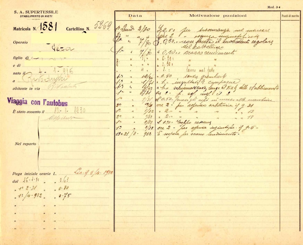 Tanto per citare qualche caso, una signora di 33 anni, nata e domiciliata a Rieti, operaia nel reparto di aspatura, una delle prime operaie occupate nel giugno del 1925 nello stabilimento di Roma e poi trasferita a Rieti, venne licenziata nel giugno del 1932 in seguito ad una malattia agli occhi che, secondo il parere di un grande specialista in oculistica quale Benedetto Strampelli, figlio del famoso scienziato genetista Nazareno Strampelli, poteva essere insorta a seguito delle ripetute irritazioni a cui erano stati soggetti gli occhi per il continuato lavoro in ambienti saturi di vapori acidi e di polveri. In ogni caso, di fronte all’insorgere di malattie professionali la dirigenza della fabbrica proponeva il licenziamento previo indennizzo o l’assunzione di un familiare in luogo dell’operaio divenuto inabile al lavoro, pur senza riconoscere una responsabilità diretta.