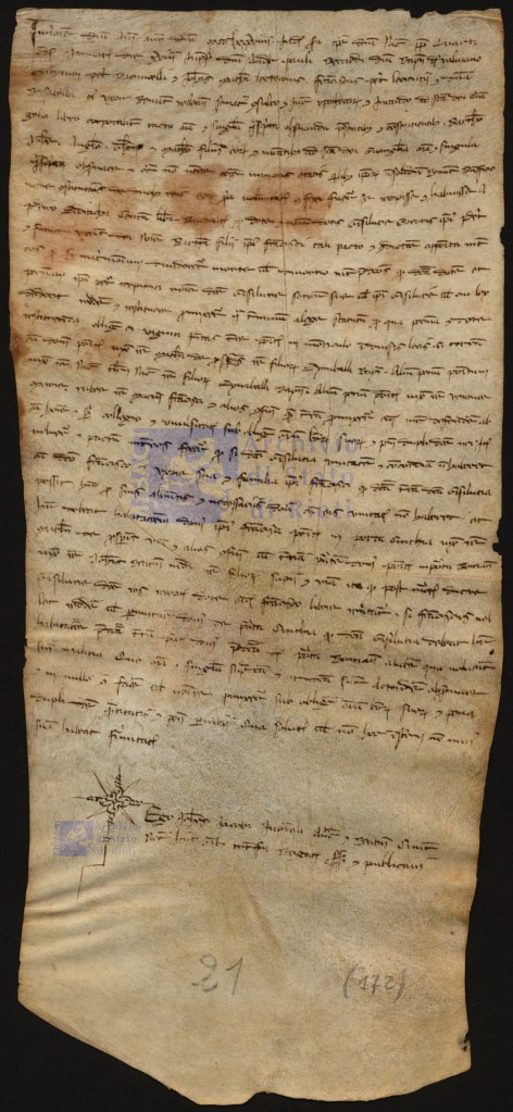 Nulla di eclatante, si direbbe; anzi, rispetto agli esemplari di documenti pubblici di cui ci siamo occupati nei precedenti appuntamenti di questa rubrica “emergenziale”, quasi una monotona enumerazione di beni, di somme di denaro e delle clausole che li legano tra loro nella cornice del rapporto giuridico. La stessa esteriorità del documento colpisce assai meno l’occhio di chi lo guarda e lo stile del testo, meno disteso e retorico, non rapisce certo quanto l’eleganza del linguaggio cancelleresco. Lo schema protocollare è scarno, frutto di quella ibridazione di espressioni di religiosità cristiana (l’invocazione del Signore all’inizio) e di prescrizioni di legge e di rito (la data, il luogo, i testimoni) che è tipica del filone privato. Poi nessun preambolo formulare, ma solo l’essenziale a livello dispositivo, a cominciare da quelli che appunto si definiscono gli essentialia negotii, cioè i nomi e le qualifiche dei soggetti coinvolti, la natura giuridica dell’atto, gli oggetti del medesimo precisamente determinati per confinazioni, misure, pertinenze, accessioni, ecc. A questi elementi imprescindibili seguono di solito – e qui andiamo per un istante anche oltre la struttura specifica del nostro documento del 1289 – i naturalia negotii, ossia i caratteri che rispondono alla natura del negozio e che perciò sono propri e di norma presenti (a meno che non siano esplicitamente esclusi), come la defensio e la pena contrattuale; quindi gli accidentalia negotii, ovvero eventuali elementi che modifichino il negozio tipo, dunque condizioni e convenzioni espresse in specifiche clausole, e le renuntiationes a eventuali benefici di legge. L’ultima parte del testo è la rogatio, l’esplicita richiesta di scritturazione e, in talune circostanze, di pubblicazione rivolta al notaio nel caso – ed è il nostro – in cui il documento non sia autografo dell’emittente. L’ingrediente grafico più appariscente è infine il signum tabellionis o notarile che campeggia nell’escatocollo e che, in endiadi con la sottoscrizione del notaio, conferisce autenticità legale al documento.